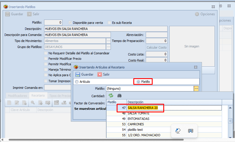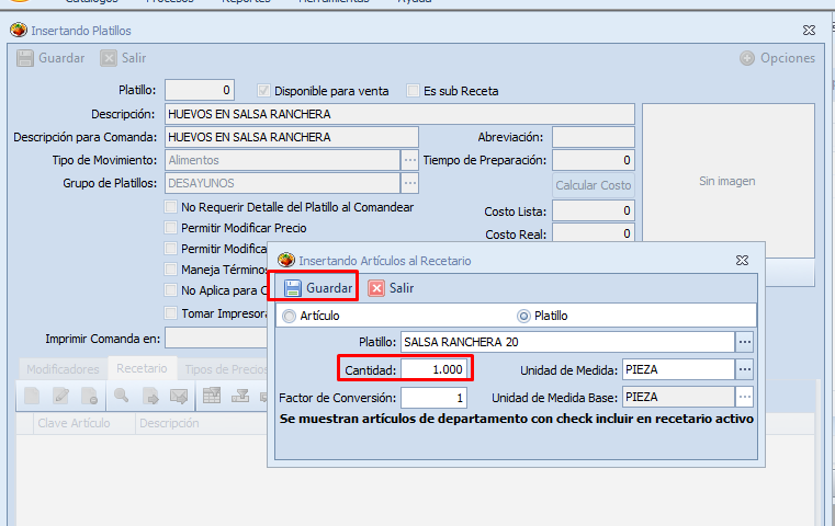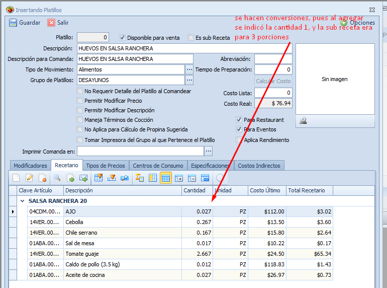 Si esta sub receta se utiliza por ejemplo en un nuevo platillo llamado «Huevos en salsa ranchera» para no agregar individualmente los artículos AJO, Cebolla, etc., se agrega el platillo marcado somo sub receta: