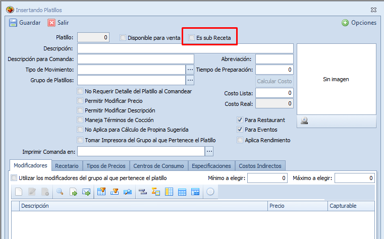 Al activar ese check, el platillo puede ser usado como recetario de nuevos platillos, se crean «sub recetas» cuando existen por ejemplo salsas que se utilizan en la preparación de otros platillos, por ejemplo, la siguiente salsa: